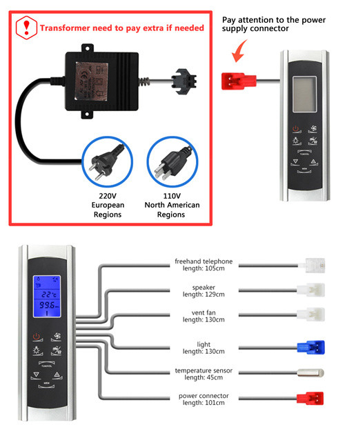このコントロール パネルにある機能は出口ファン、屋根ライト、FMのラジオ、ハンズフリーの遠く、声および温度調整です。出口ファンは人が蒸し風呂/シャワーを取るとき必要です。空気の循環は蒸気がシャワーの小屋の小さいスペースで曇ったときに保証することができます。それは安全、健康です。FMのラジオはより多くの楽しみおよび弛緩を持って来ます。音楽、ニュース、audiobookの…人々は楽しを持つために十分に退屈しません。人にシャワーの時間にを取扱われる非常事態の必要性があればハンズフリーの遠い役立ちます。そして素晴らしい水温は温度調整ボタン、それを通してです便利調節することができます。