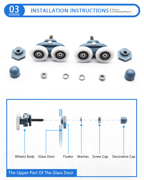 ドアの滑走を滑らかにするために仕事にローラーをとの滑らせるシャワーの小屋の必要性の引き戸。 シャワーの引き戸のローラーに異なった厚さガラスのドアのために適したシングルまたはダブルの車輪および異なった組合せがあります。適度な付属のプロジェクトはシャワーの小屋またはエンクロージャの滑走機能のために重要です。