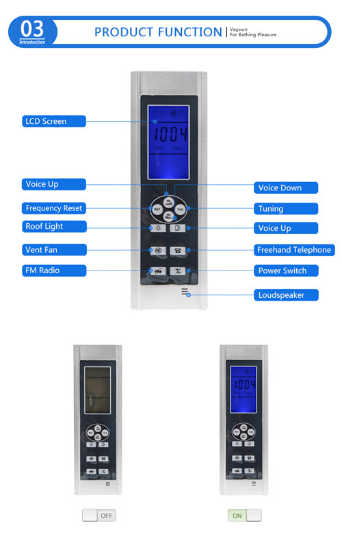 他の付属品によって、換気扇のような結合されるシャワーの小屋に主に加えられる等のはちょうど制御panle、スピーカー、導かれたライト、電源コネクタです。このデジタル制御のパネルによって、それはユーザーのためにより便利楽しみます多数機能によってシャワーをです。操作インターフェイスにキーの押すおよびLCDスクリーンの接触があります。私達が照会に相談し、送ることを持っているシャワーの小屋のコントロール パネル、歓迎の変化。
